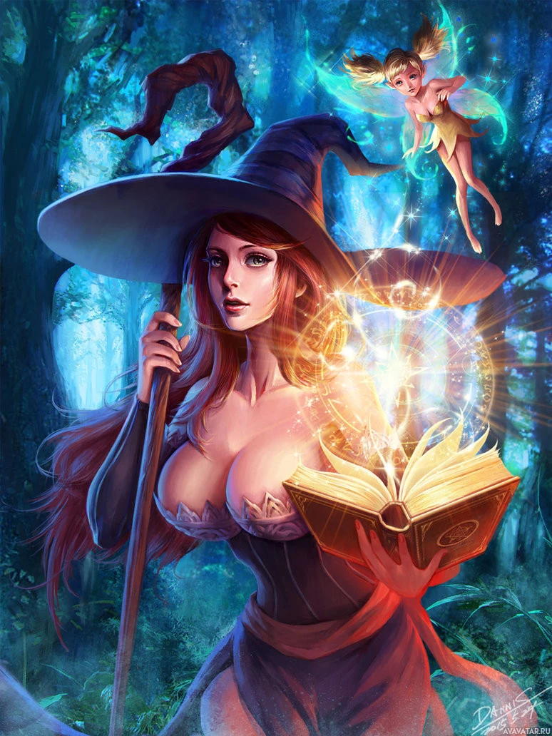 The image depicts a fantasy-themed illustration. It features a woman dressed in
