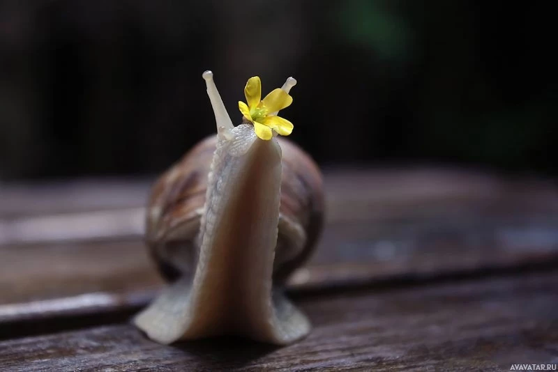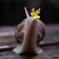На картинке изображена улитка с желтым цветком на голове. Улитка расположена на том, что кажется куском дерева или поверхностью с деревянной текстурой.