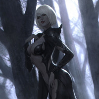 a female character with white hair standing in a forest setting. She is dressed in a fantasy-style outfit that appears to be armor or