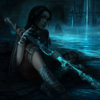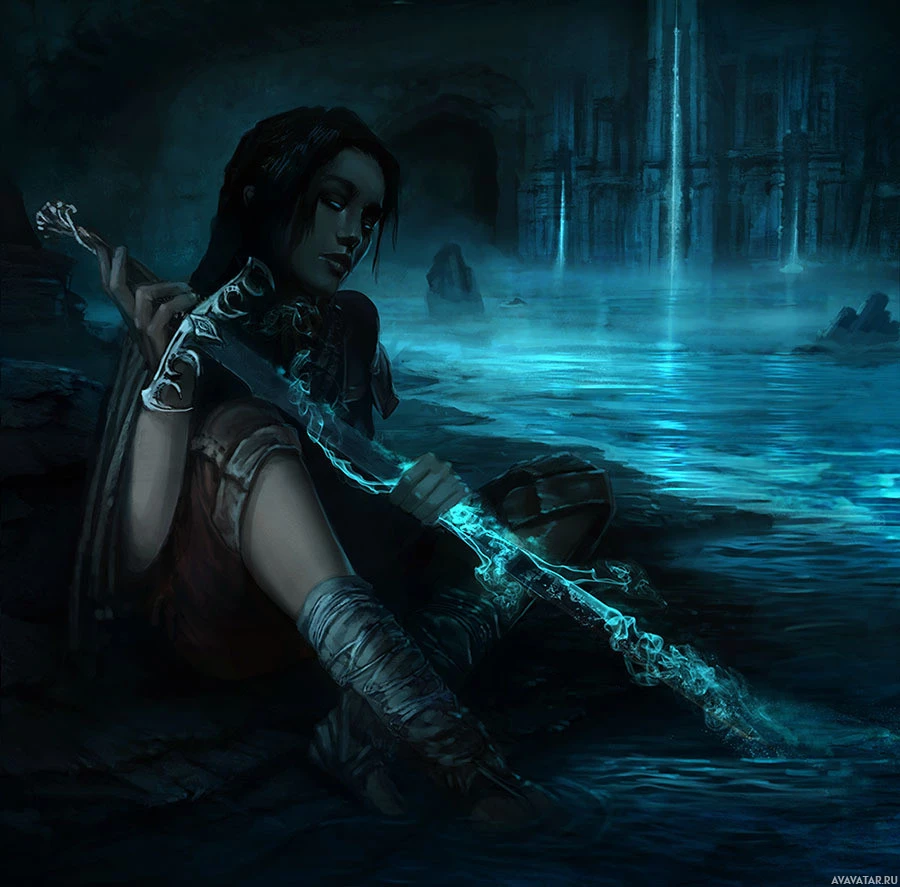 dark hair and is sitting on what seems to be an icy surface or body of water, holding a sword with both hands as if she's playing it like a stringed instrument. The background suggests a mystical or otherworldly environment with misty lighting and ruins, which could indicate the scene takes place in