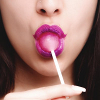 На картинке изображен человек с розовыми губами, кусающий фиолетовые конфеты. Фон размыт и не содержит каких-либо конкретных деталей о местоположении или контексте фотографии.