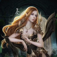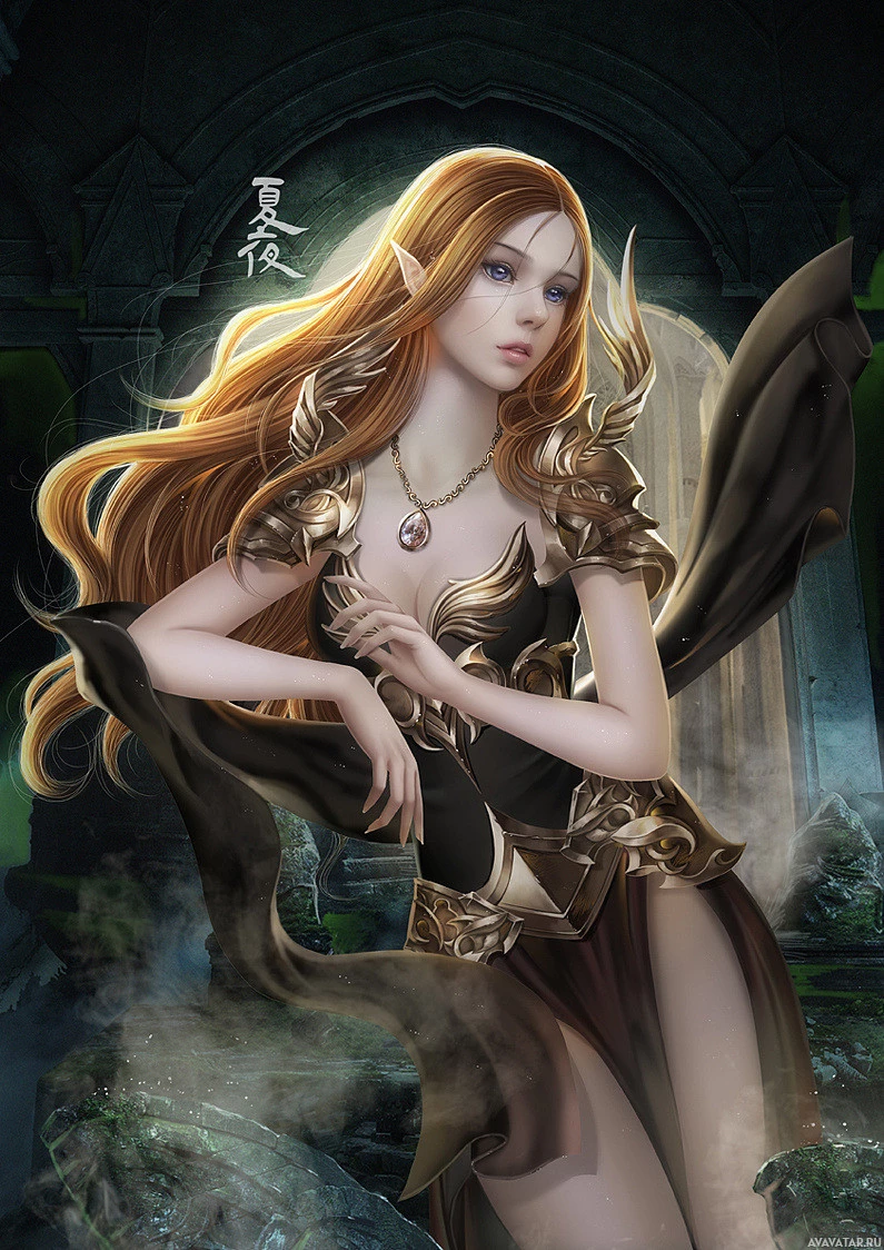a fantasy setting. The character is depicted with long golden hair, fair skin, and striking