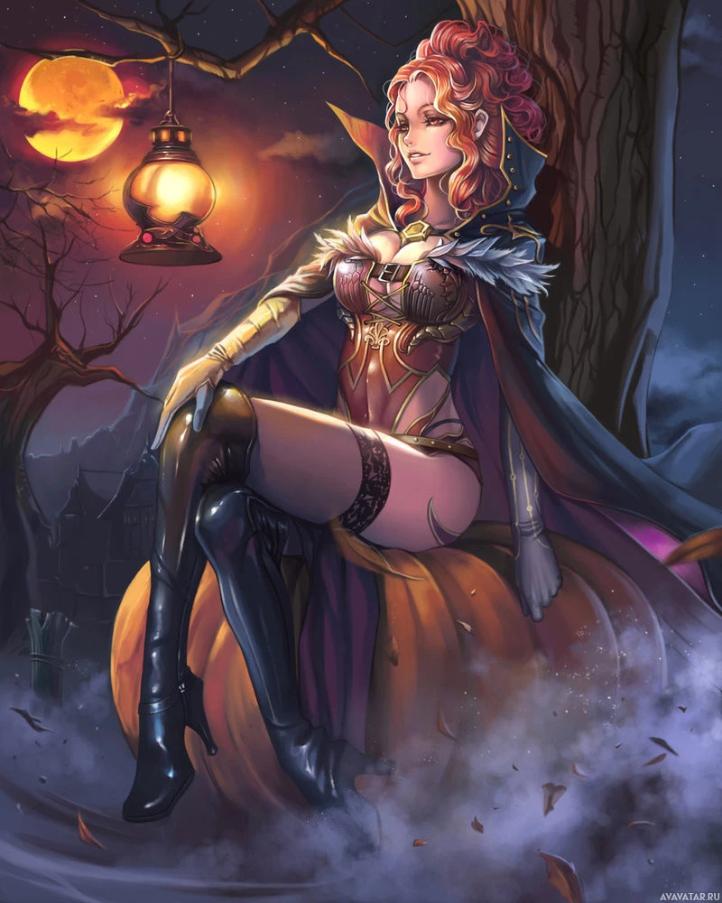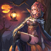 additional lighting for the image. The overall theme suggests Halloween and might be associated with fantasy or horror genres due to the costume and setting.