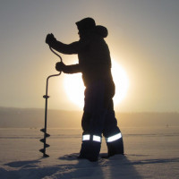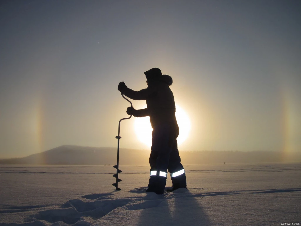 The image shows a silhouette of a person standing on what appears to be an icy surface, possibly a frozen