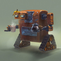 The image features a robot with human-like hands holding a coffee mug. It has mechanical parts and appears to be standing on four legs. The background is neutral, emphasizing the central figure of the robot.