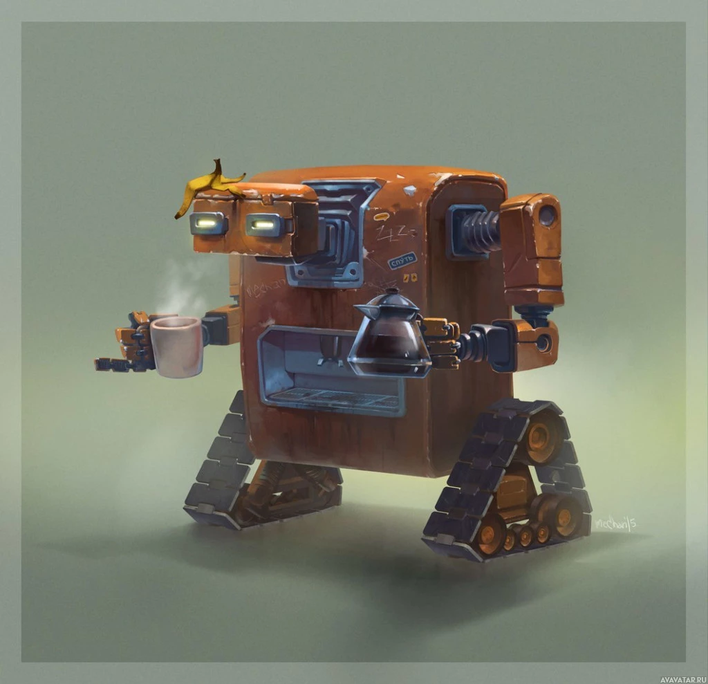 На картинке изображен робот с человеческими руками, держащими кофейную кружку. Он имеет механические части и стоит на четырех ногах. Фон нейтральный, подчёркивающий центральную фигуру робота.