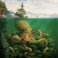 underwater scene. There is an octopus in the foreground, with its tentacles spread out across the bottom of the image. In the background, there's a castle that appears to be perched on an island surrounded by water. Above this island, there are clouds and some