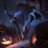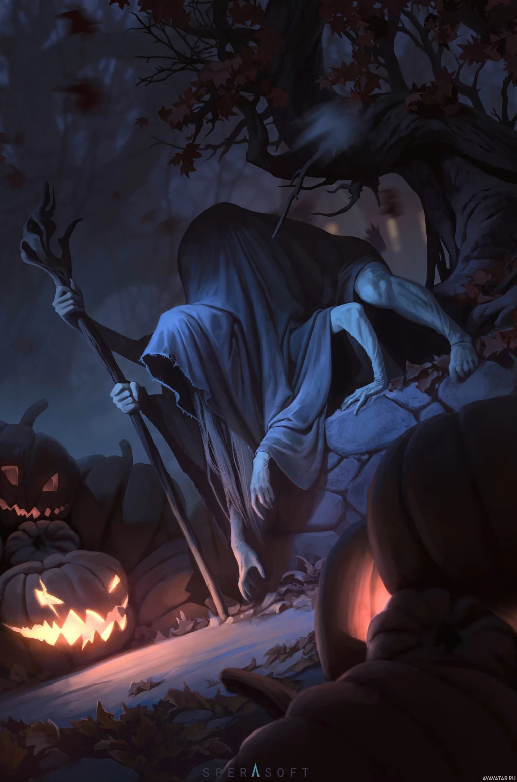 The image depicts a Halloween-themed scene with