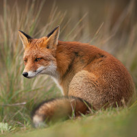 The image features a fox, which is an animal. The fox is sitting or lying on what appears to be grass or vegetation in a natural setting, possibly during dusk given the soft lighting and coloration of the scene. It's a wildlife photograph that captures the essence of the animal in its environment.
