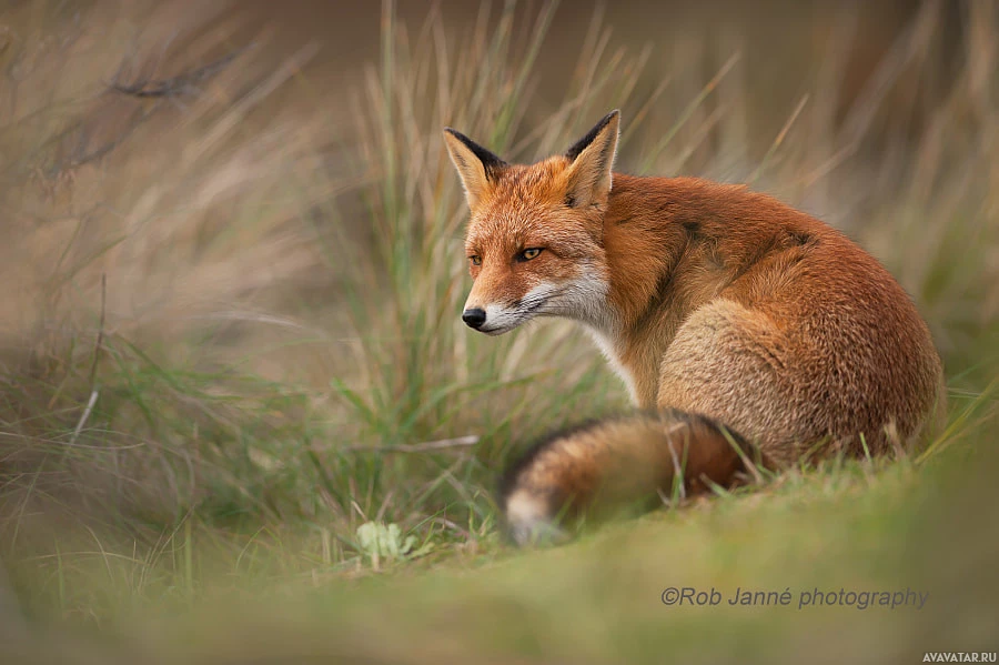 На картинке изображена лиса, которая является животным. Лиса сидит или лежит на траве или растительности в естественной обстановке, возможно, во время сумерек, учитывая мягкое освещение и окраску сцены. Это фотография дикой природы, которая отражает сущность животного в окружающей среде.