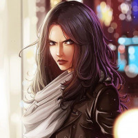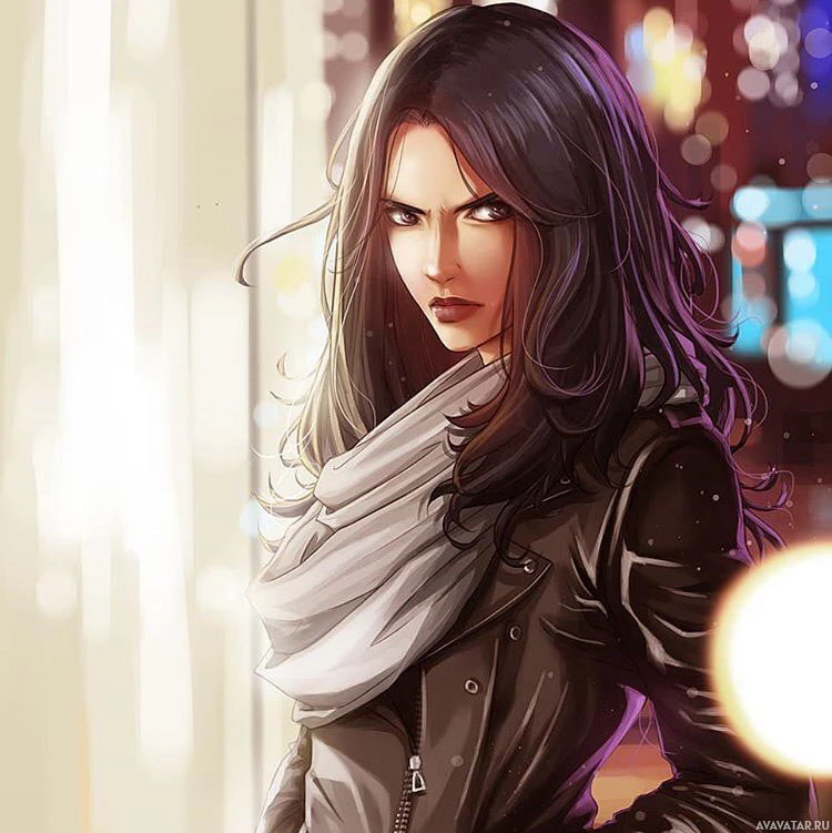На картинке изображен персонаж, который кажется женщиной, возможно, из графического романа или мультсериала. У нее темные волосы и она носит кожаную куртку. Есть сильное чувство, что она находится в городской обстановке со светящимся знаком позади нее, предполагая, что она может быть ночью или в городской среде. Стиль напоминает современные комиксы или графические романы.