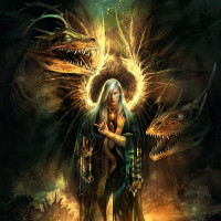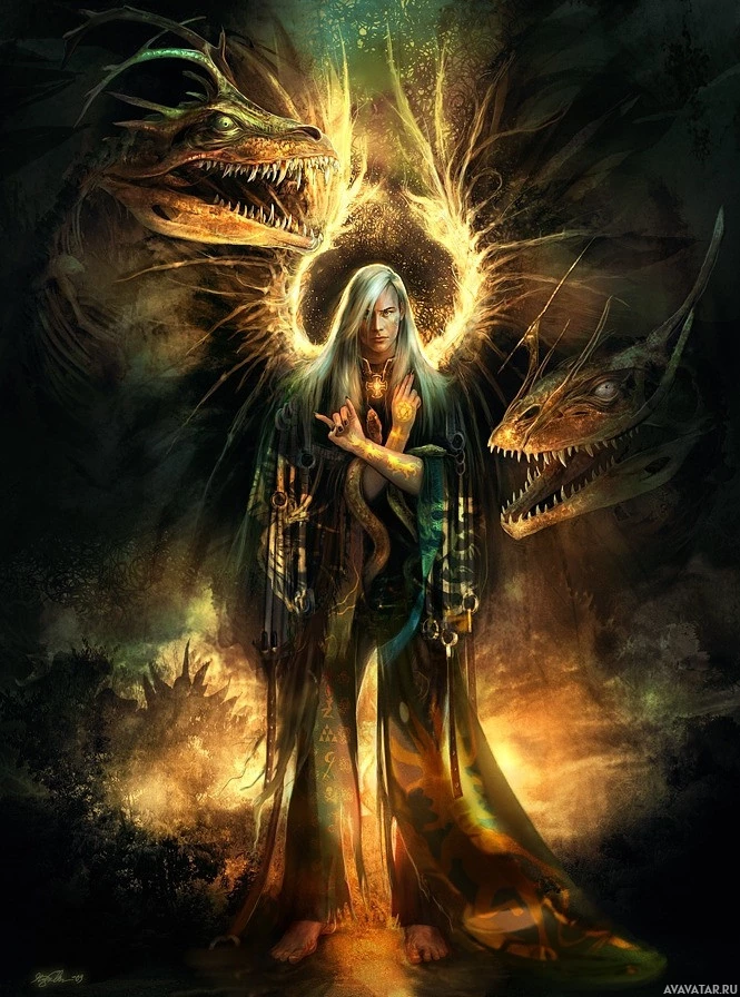 an ethereal presence amidst two dragons on either side of them. This figure is dressed in flowing robes and has
