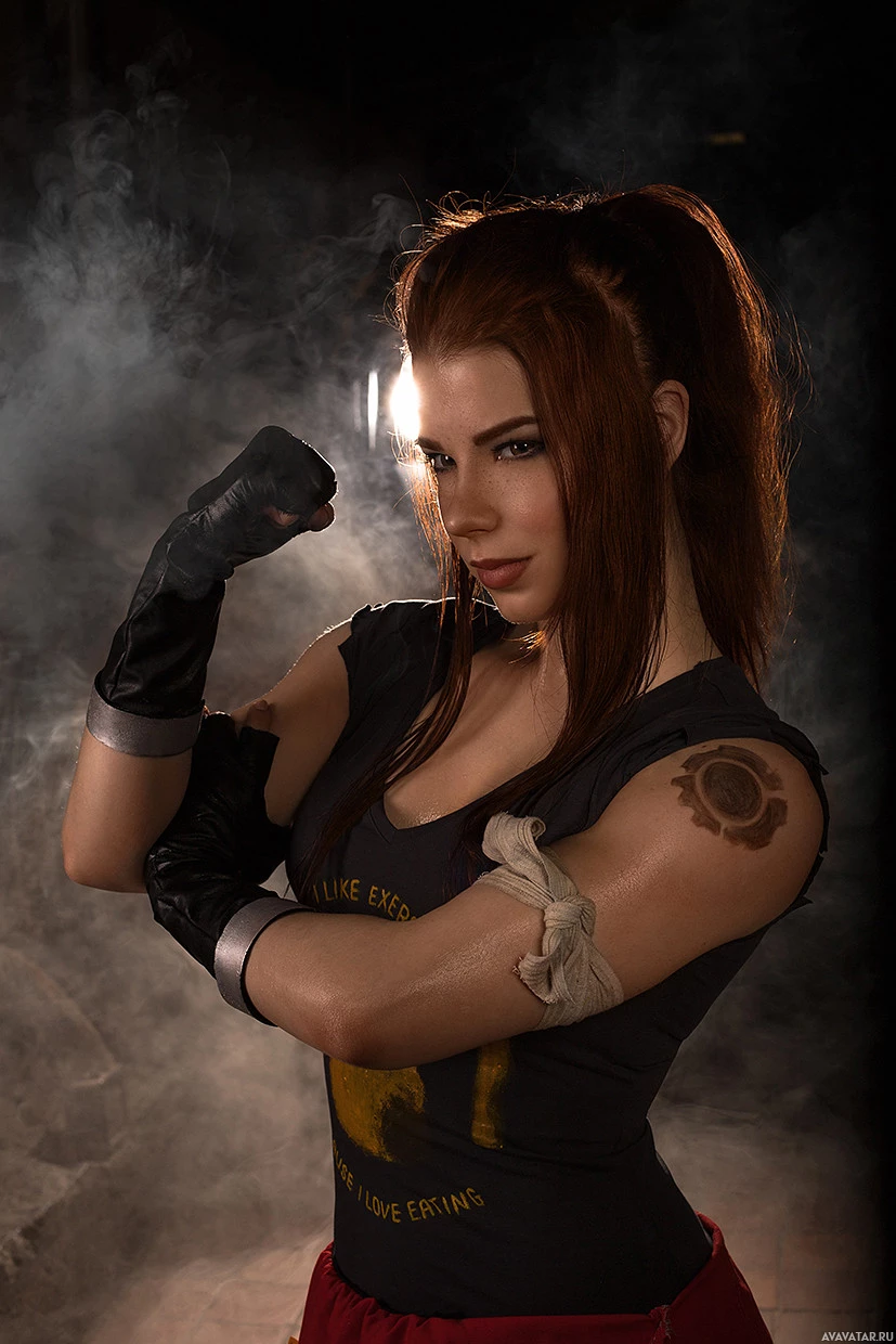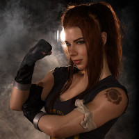 The image features a woman in a costume that appears to be inspired by the character Brigitte from