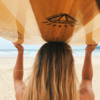 На фотографии изображена женщина на пляже. Она держит доску для серфинга над головой и, кажется, находится перед океанскими волнами, предполагая, что она может готовиться или возвращаться с сеанса серфинга. Женщина имеет длинные волосы и носит купальный костюм, подходящий для занятий водой.