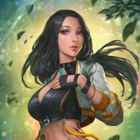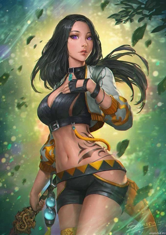 dynamic poses and attire, suggesting she may be a warrior or fantasy character. The background has