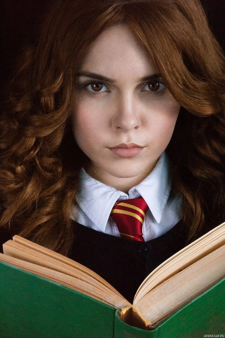 a common activity associated with the character Hermione. The background is dark, which contrasts with the brightly lit subject and