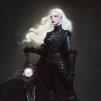 blonde hair and is wearing armor, which suggests she might be a warrior or a knight. She also holds a sword, indicating that her role could be one of combat or defense. Her attire includes boots and gloves, further emphasizing her readiness for battle. The character is standing on what appears to be a rocky surface or a platform with a stone-like texture in the background, which adds to the fantasy or