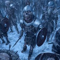 an outdoor setting with snow on the ground. These figures are wearing armor and have pale, undead-looking faces with visible