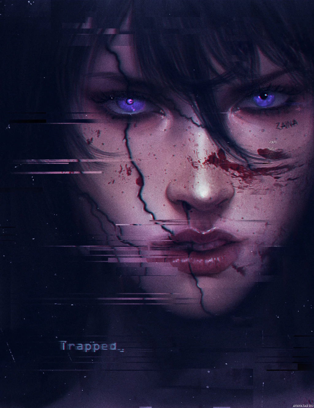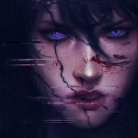 intricate tattoos or markings on her cheek and chin. There are also visible cracks or splits in her skin, which could symbolize vulnerability or transformation. The art style combines elements of realism with digital or pixelated effects, giving the image a futuristic or