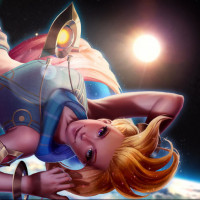 a dynamic pose, as if she's floating or falling through the air. The background suggests a space setting with planets and stars visible, indicating that this might be from