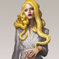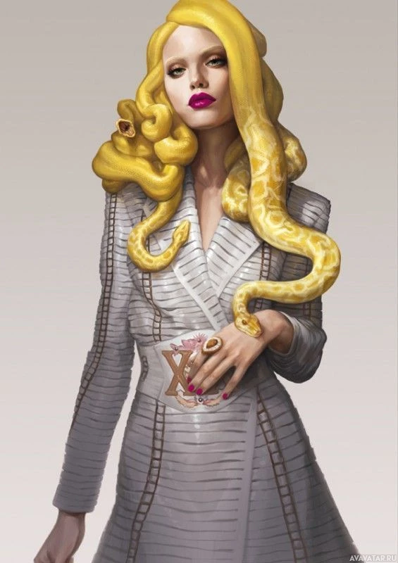 golden hair, styled in Medusa's fashion from classical mythology. She has snakes instead of hair and is wearing a high-