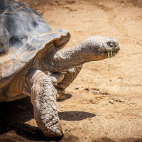 The image shows a tortoise with its head extended forward, seemingly eating or sniffing something from the ground. The background appears to be a dry, sandy surface that could be a desert-like environment.