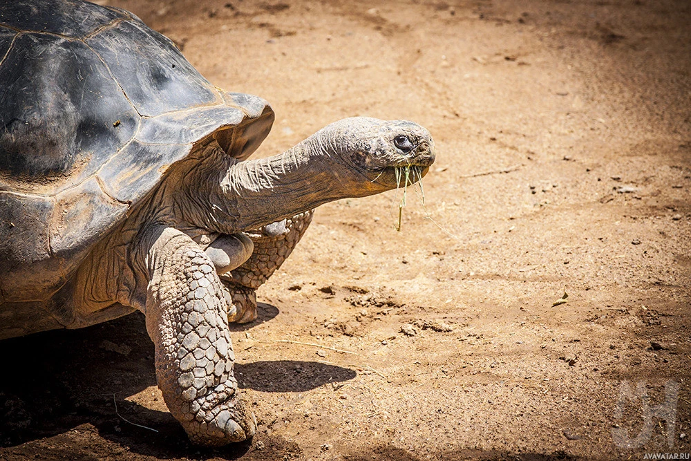 На картинке изображена черепаха с вытянутой вперед головой, которая, по-видимому, ест или нюхает что-то с земли. Фон кажется сухой, песчаной поверхностью, которая может быть пустынной средой.