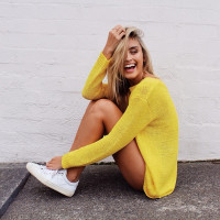 The picture shows a woman sitting on the ground with her legs crossed. She is wearing a yellow top and appears to be in a joyful mood, as she has