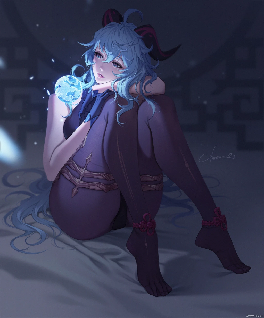 an animated character that appears to be a girl with horns and blue hair. She's sitting on what looks like a bed or couch with her legs crossed. The character has