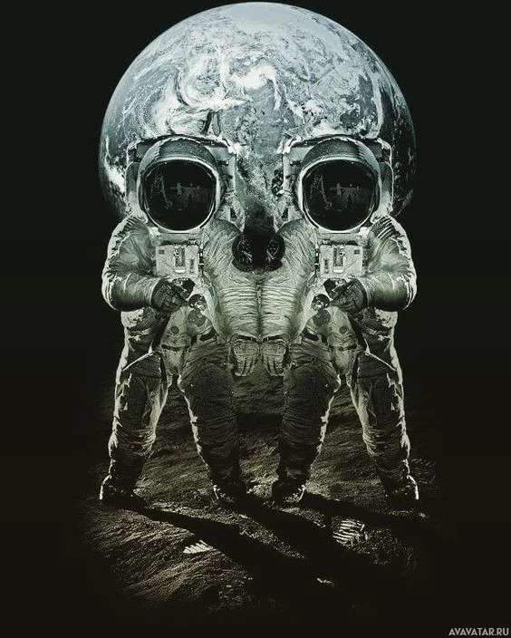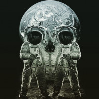 The image depicts a skull with human-like features, such as an astronaut's helmet and suit. The skull is set against