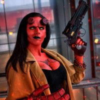 a fiery background, likely symbolizing hell or flames. This cosplayer has taken on the persona of Hellboy, complete with the iconic