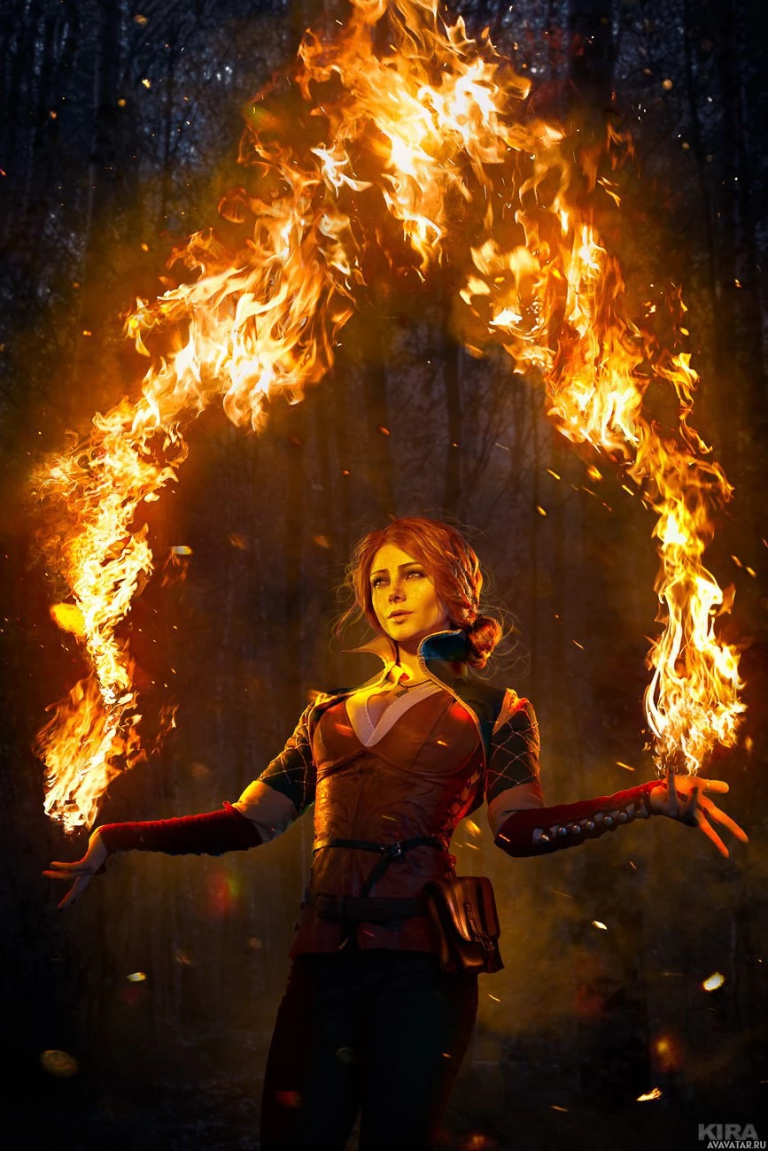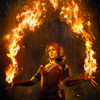 a dynamic pose with fire elements arranged around her, suggesting she is casting or controlling these flames. Her attire and the setting give the impression that this is a cosplay representation of her character. The background has a dark and moody atmosphere, enhancing the mystical and supernatural theme of her portrayal.