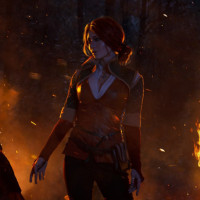 the video game "The Witcher 3: Wild Hunt," specifically Triss Merigold. She is shown standing amidst chaos, with flames surrounding her and three other figures who appear to be in distress or pain. The scene suggests