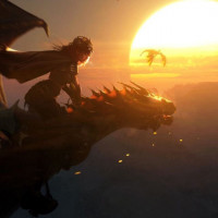 an open sky during sunset or sunrise, with the Sun visible in the background. There are also smaller dragons flying nearby, adding to the mythical and adventurous atmosphere of the image. The overall composition suggests a theme of courage, adventure, and fantasy elements commonly found in high-
