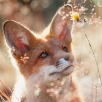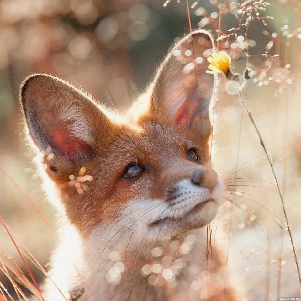 На снимке изображена красная лиса, стоящая в высокой траве. Похоже, что это молодая лиса с поднятыми ушами, которая смотрит на что-то за кадром. Обстановка кажется безмятежной, возможно, рано утром или поздно днем из-за теплого освещения, которое предполагает восход или закат солнца.