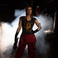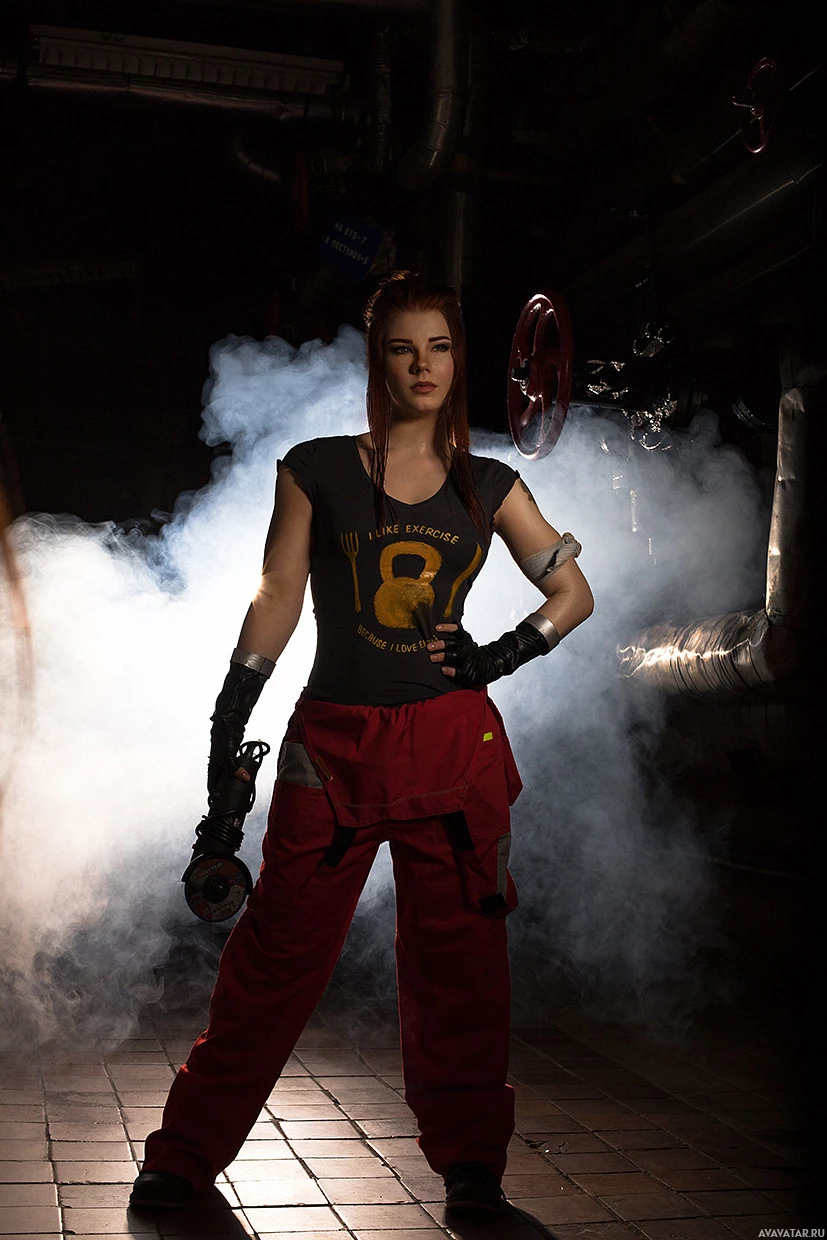 The image features a person dressed in cosplay, emulating the character Brigitta from