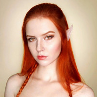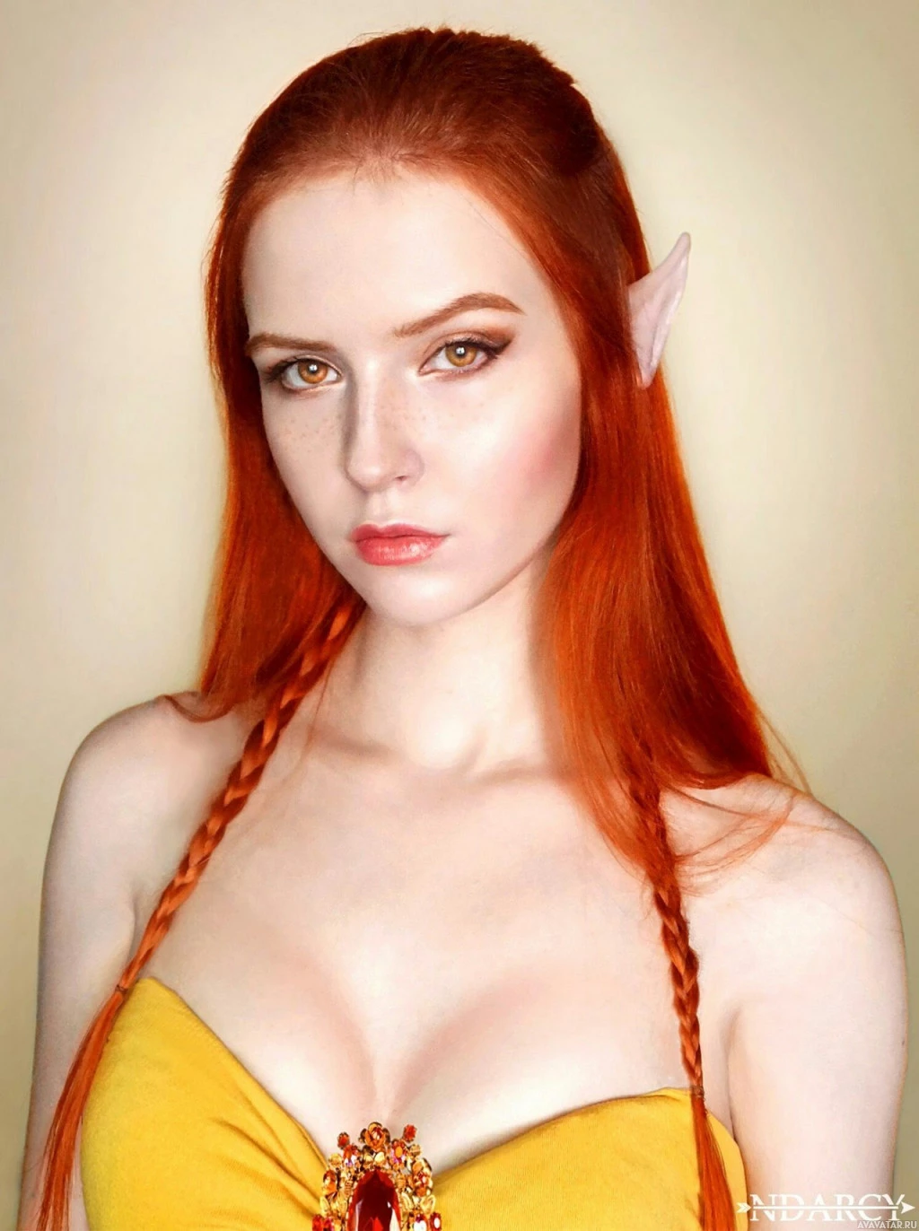 red hair styled in a way that resembles an elf from fantasy settings. They are wearing a costume that appears to be inspired by characters from