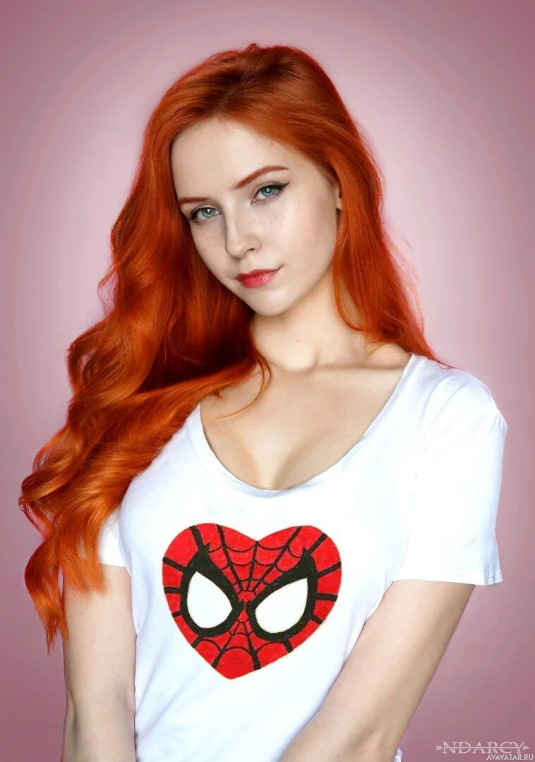Jane Watson, a character from the Spider-Man comics and films. They are wearing a white t-shirt with an embroidered