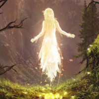 a ghostly figure that appears to be floating above a forest floor, with its arms outstretched as if embracing nature or communicating with the elements. The background features a forest landscape with trees and foliage, contributing to