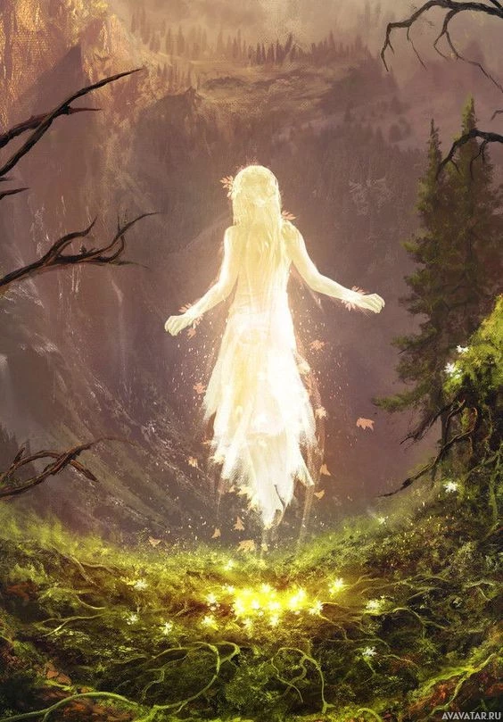 magical sparkles near the ghostly figure, enhancing the ethereal quality of the image. This scene could be described as having an 'otherworldly' or 'spiritual' theme, fitting within