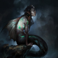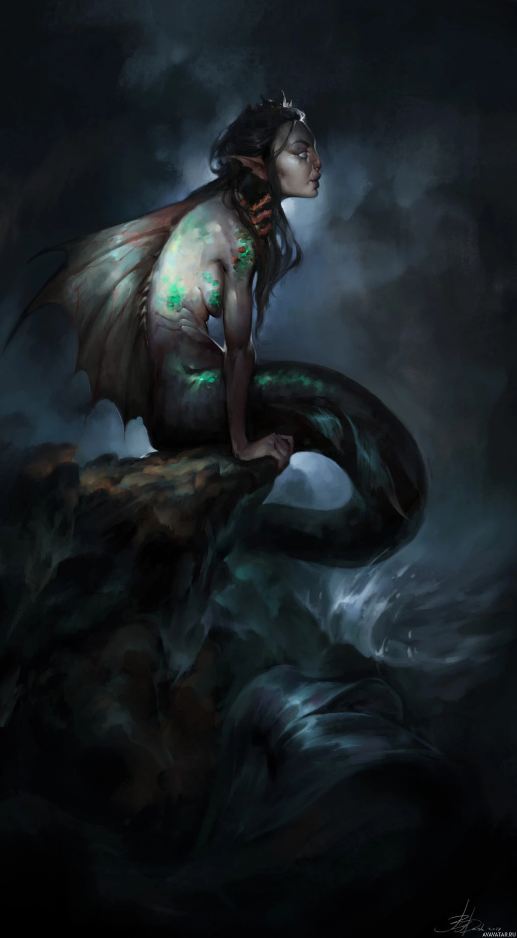 long hair, a human-like torso, and a fish tail instead of legs. The setting is dark and moody, with clouds and waves in the background. It's a work of
