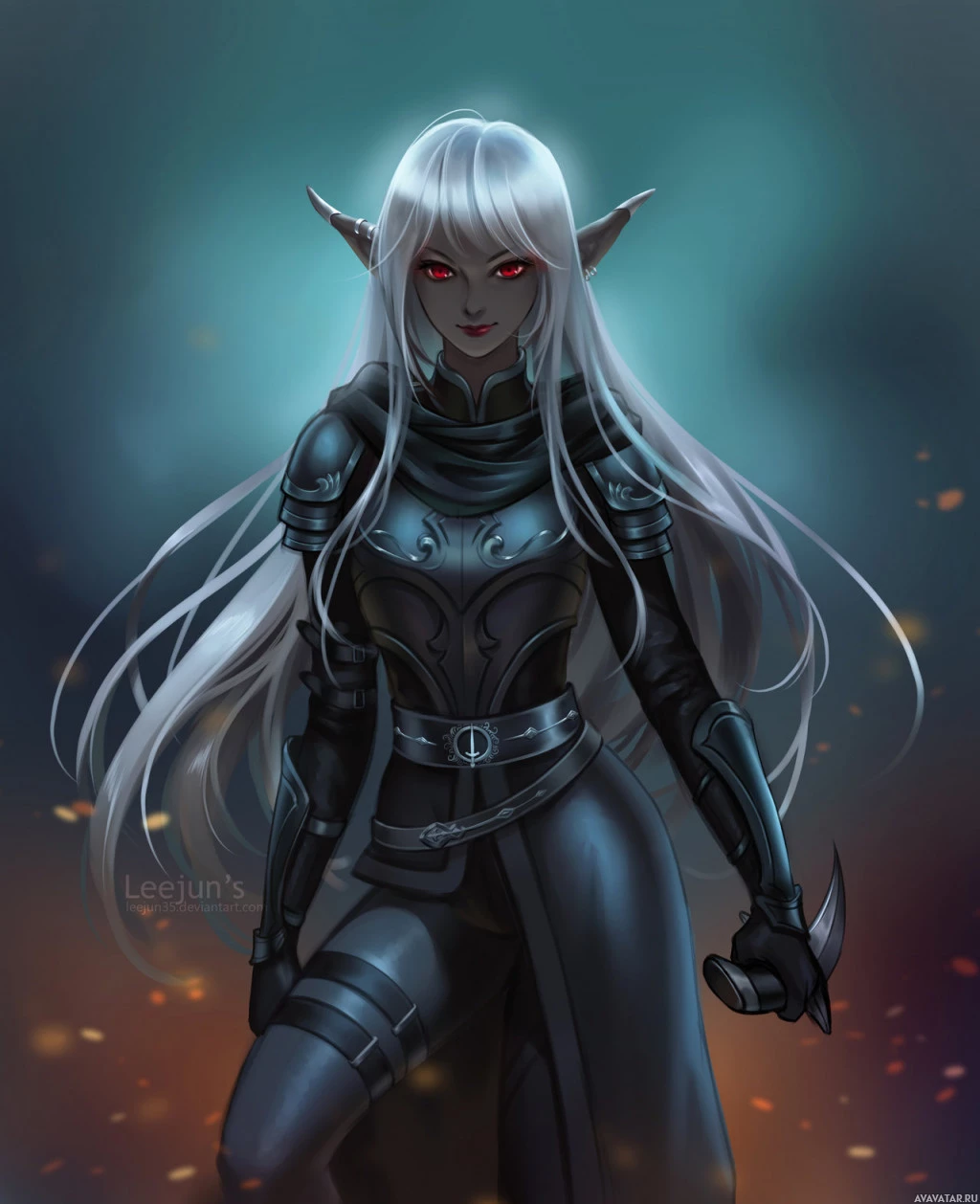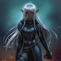 a female character with white hair, wearing what appears to be armor or battle attire. She is styled in a way that suggests she may represent a fantasy-based character, possibly inspired by the Drow race from