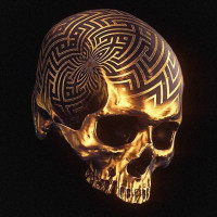 The image shows a gold-plated skull with an intricate pattern on the top of its head. The pattern resembles a maze or labyrinth, composed of interlocking lines and shapes. The skull is presented against a dark background that accentuates its golden appearance and the complexity of the design.