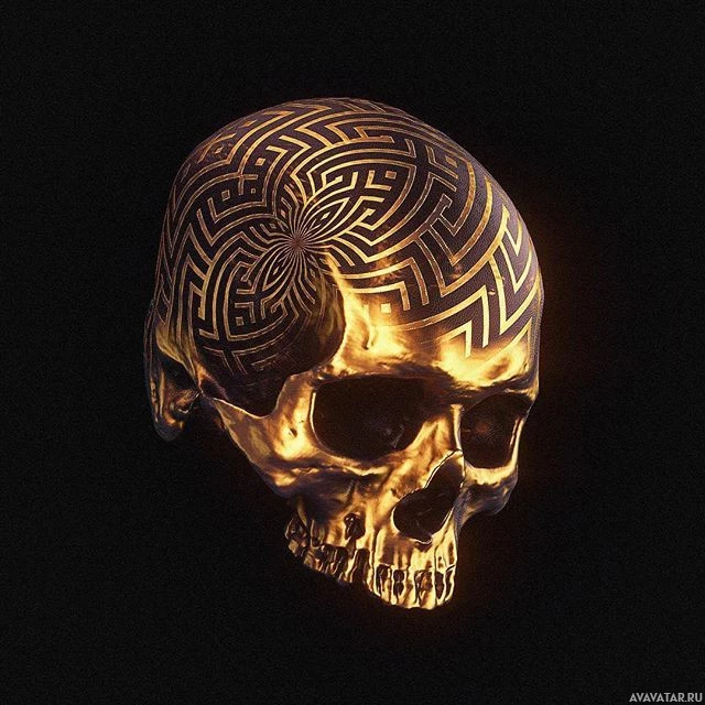 На картинке изображен позолоченный череп с замысловатым рисунком на верхней части головы. Узор напоминает лабиринт или лабиринт, состоящий из взаимосвязанных линий и форм. Череп представлен на темном фоне, что подчеркивает его золотой внешний вид и сложность конструкции.