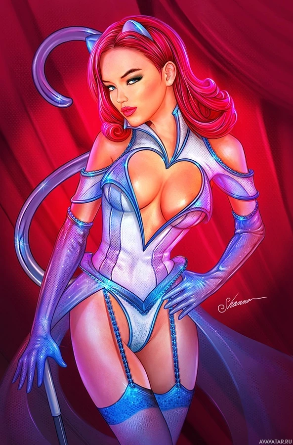 red hair and a costume that resembles a superhero or supervillain. She is wearing a bodysuit with