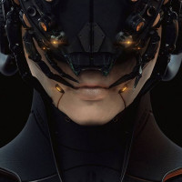 mechanical parts, which includes what seems to be an intricate mask or helmet that covers the entire head, including the eyes. The overall design is reminiscent of
