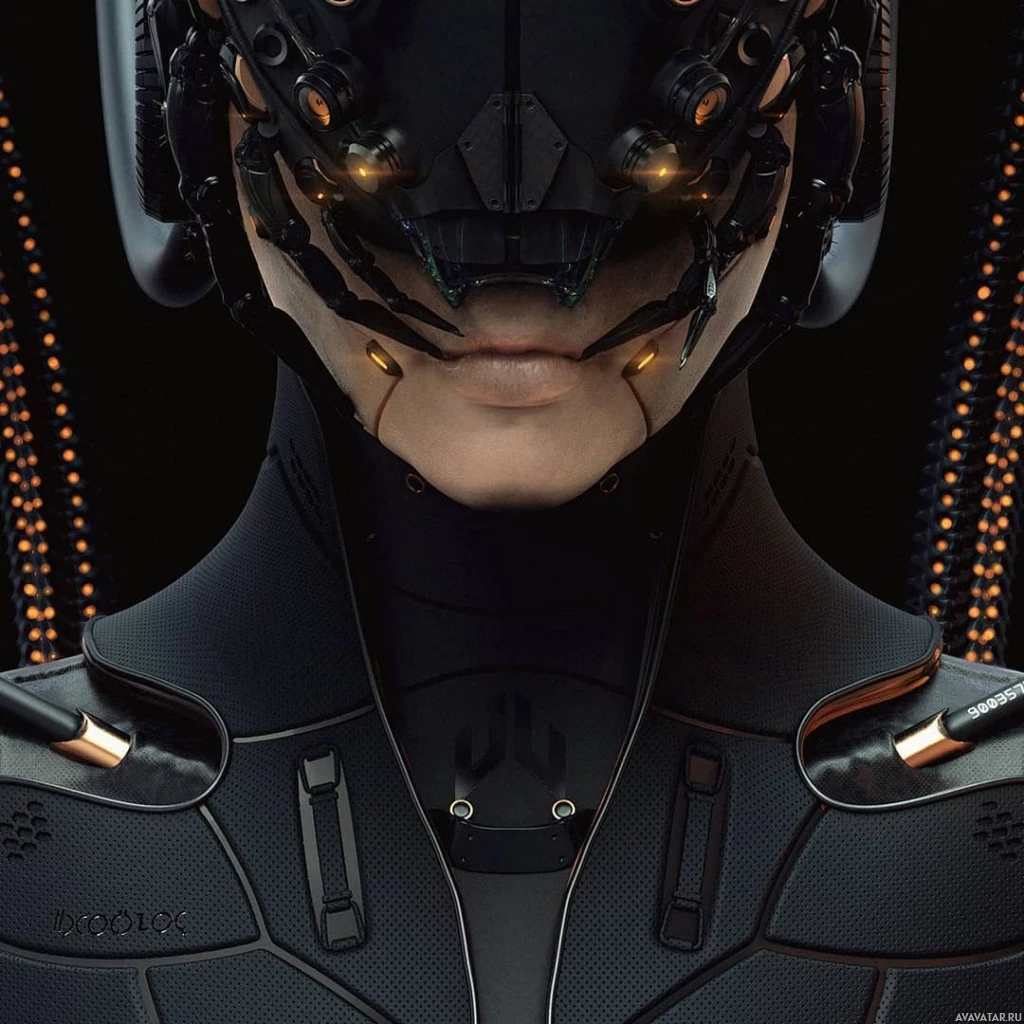 advanced technology or weaponry components. The face of the character appears to be a blend of human features enhanced with