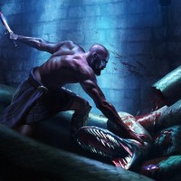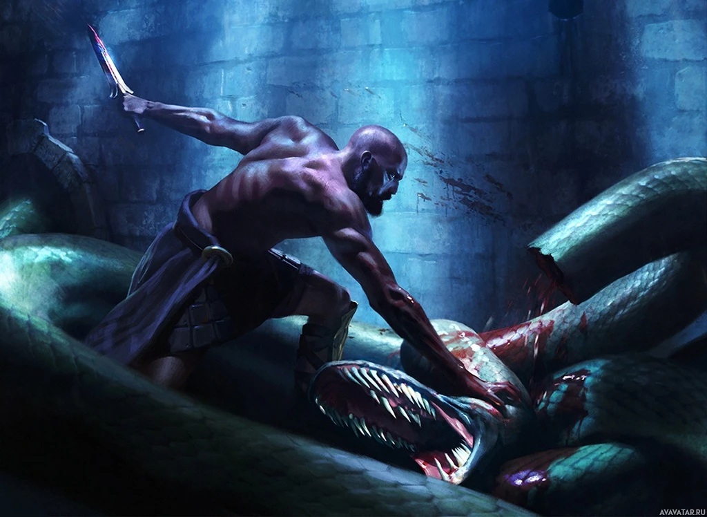 a fantasy scene where a muscular man is cutting the throat of one or more serpentine creatures. The setting appears to be underwater, with stone walls and