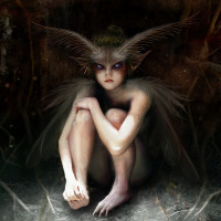 mythical creature. This figure has the body of a human but with wings, which suggests it might be a representation of a faerie or similar being from folklore and fantasy stories. The setting seems to be in a forest or a jungle-like environment, characterized by dark greenery and