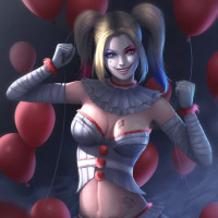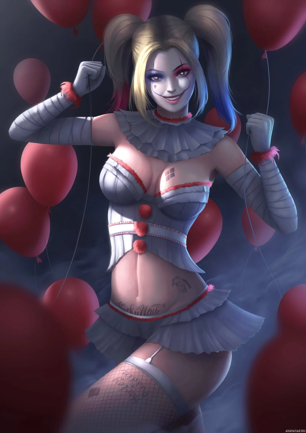 red balloons, suggesting a playful or celebratory atmosphere. The character has a distinctive makeup look with dramatic eye shadow, red lips, and